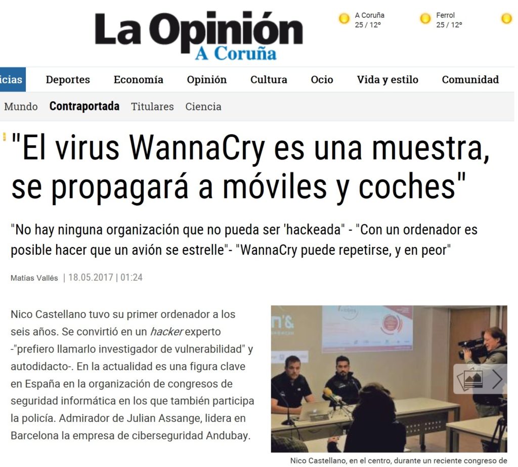 “There is no organization that cannot be ‘hacked’ – “With a computer it is possible to make a plane crash” – “WannaCry can be repeated, and worse” were some of the phrases collected from the interview that Nicolás Castellano gave to the newspaper La Opinión on March 18. It discusses the WannaCry incident and Nicolás’s personal history in the hacker world.
