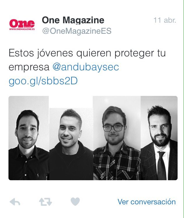 On April 11, the prestigious magazine with the most innovative content in national circulation, “One Magazine”, mentioned Andubay on its Twitter account. On that social network, they echoed the article where Andubay was named company of the month in Spain in the Cybersecurity sector and with the greatest growth, in November 2016.